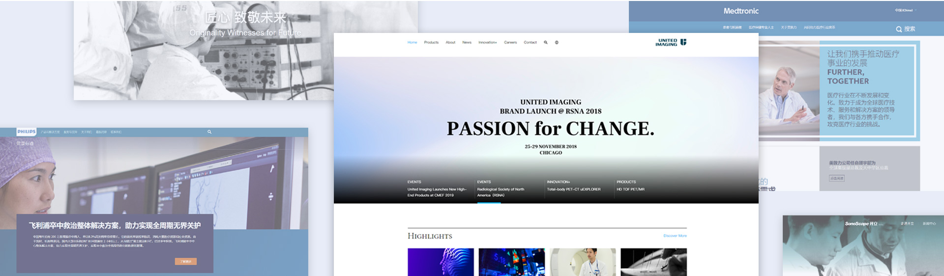 项目策划过程中(zhōng),我们对行业内其他(tā)品牌的官网进行了一个调研,了解行业的主流设计风格,以及如何在众多(duō)品牌中(zhōng)寻求自己的个性,做到品牌差异化。调研过程中(zhōng)了解到其实行业内许多(duō)品牌的网站形式还停留在比较老旧的形态上,但也不乏有(yǒu)亮点的品牌网站,如联影医(yī)疗和深圳开立生物(wù),在品牌官网的设计上都有(yǒu)自己的风格与主题。美敦力和飞利浦作(zuò)為(wèi)行业内的TOP5公(gōng)司,在官网的栏目架构上也很(hěn)有(yǒu)参考价值。