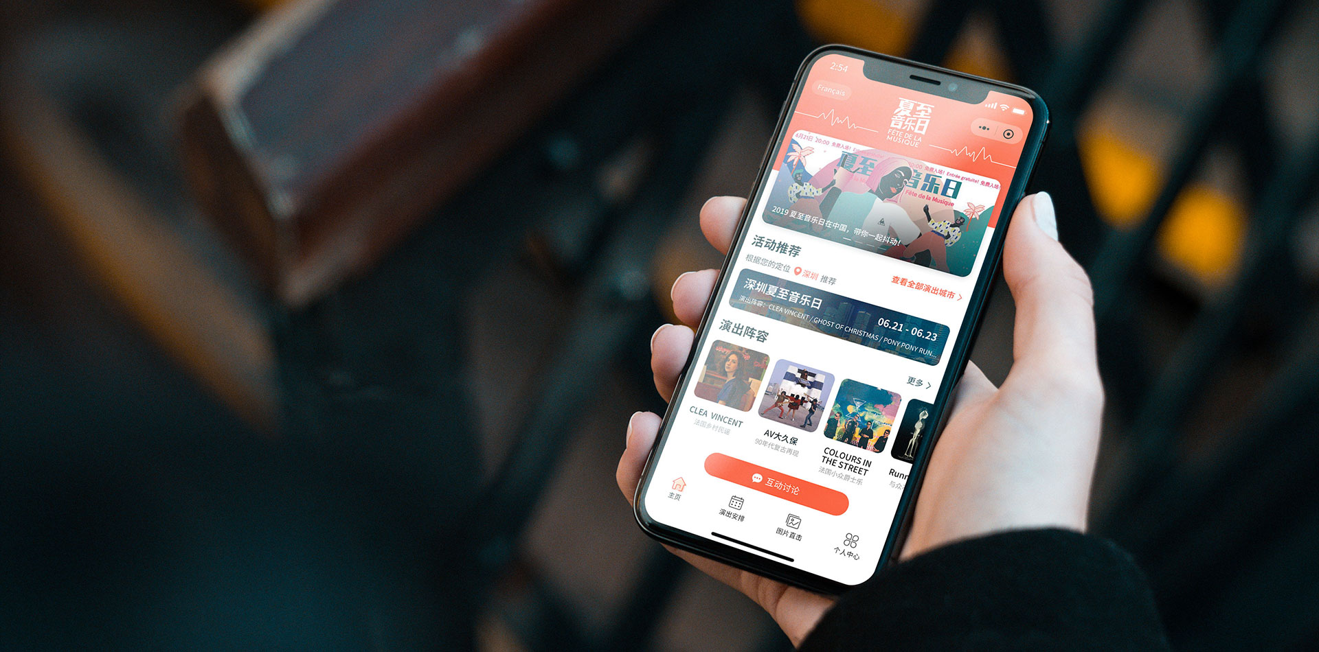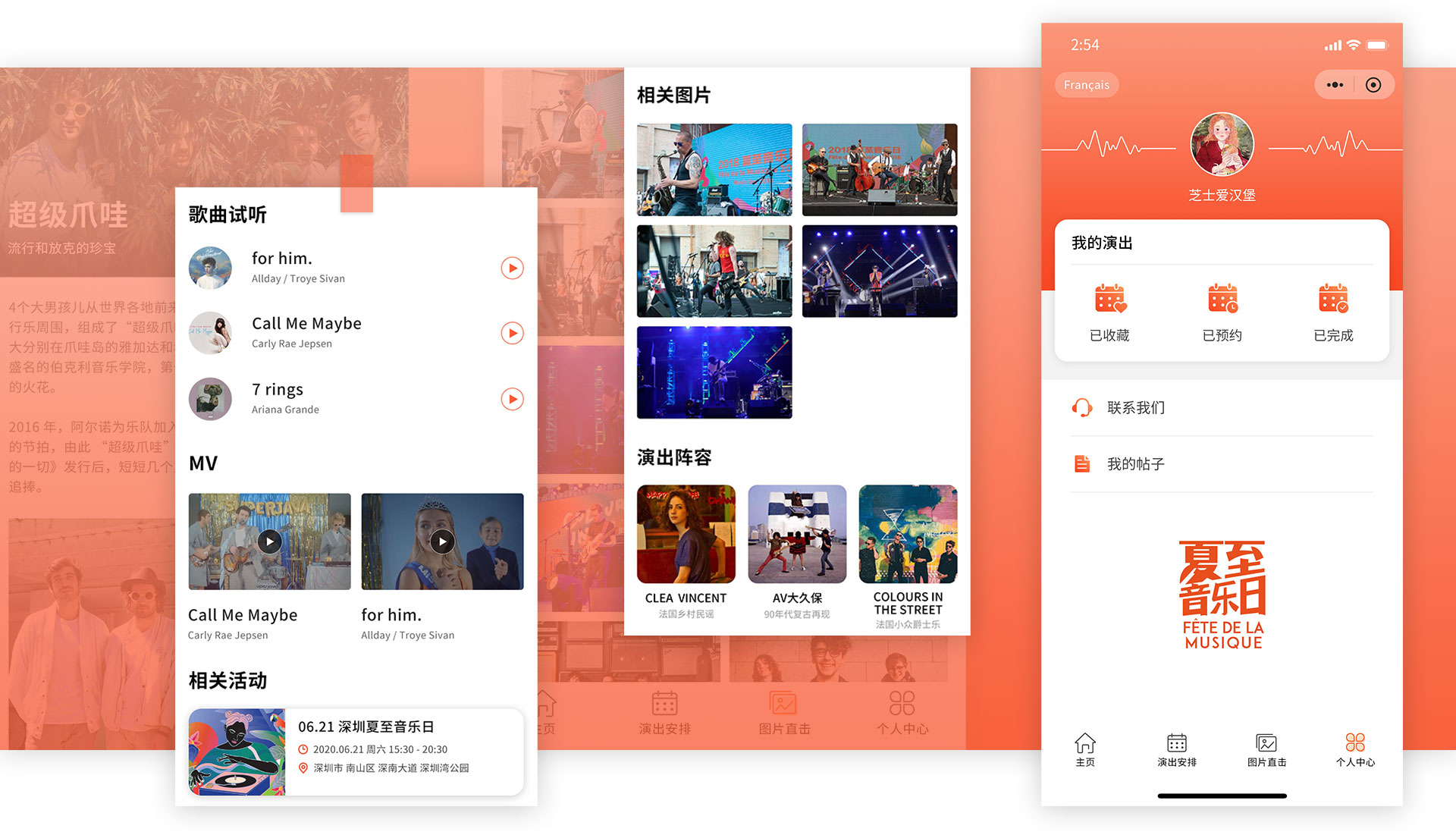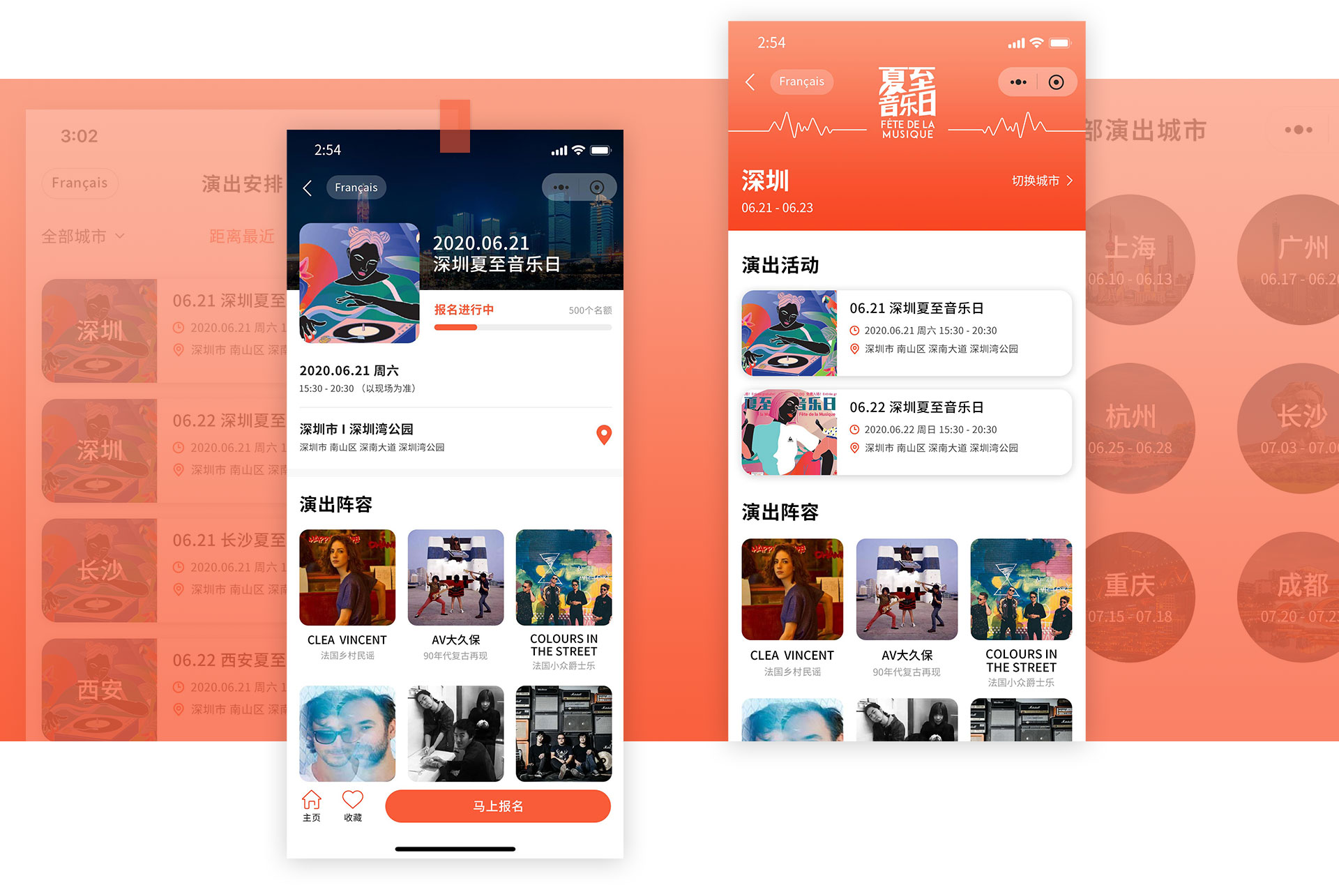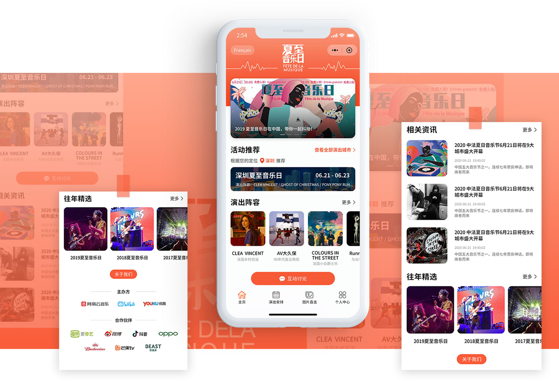 BACKGROUND 项目背景 法國(guó)驻华大使馆邀请HOLY荷勒為(wèi)夏至音乐日定制全新(xīn)的小(xiǎo)程序體(tǐ)验,设计和开发; 夏至音乐日(Fête de la Musique)是1982年在当时的法國(guó)文(wén)化部長(cháng)杰克·朗的倡议下创立的全民(mín)音乐盛典活动。夏至音乐日据不完全统计目前已经在全世界100多(duō)个國(guó)家落地,中(zhōng)國(guó)是从2006年武汉开始的第一届夏至音乐日,目前每年有(yǒu)10个左右的城市参与,会选在6月21日这一天的前后周末,不同的城市会在不同的地点和时间开始。主要的精(jīng)神有(yǒu)两个,一个是免费,全民(mín)都可(kě)以免费共享音乐,一个是交流,一般每场都有(yǒu)一到两支法國(guó)乐队,剩下的都是与他(tā)们气质(zhì)差不多(duō)的中(zhōng)國(guó)本地乐队。