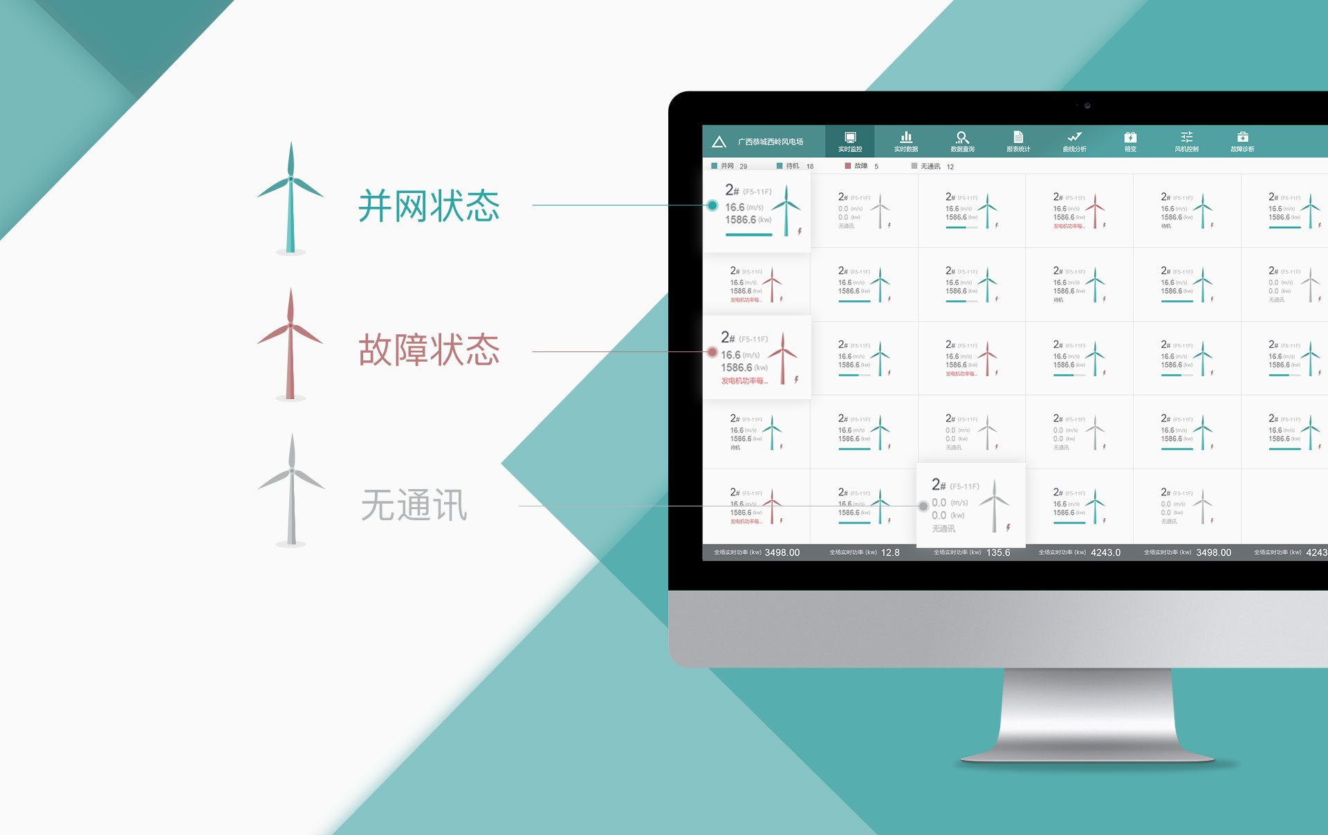 根据产(chǎn)品以数据為(wèi)主的性质(zhì),在界面设计的时候需要以简洁与舒适為(wèi)主要的方向,每个页(yè)面颜色不超过三种,并且以線(xiàn)条區(qū)分(fēn)板块,减少数字与板块间的干扰。為(wèi)了使用(yòng)户更易于读取风車(chē)的信息,我们将风車(chē)以插画的形式展现,并以不同的颜色以區(qū)分(fēn)状态,风車(chē)信息一目了然。